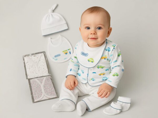 Set 5 piezas con Picot Crecoheta (batita, pantalón, gorro, escarpin y babero)